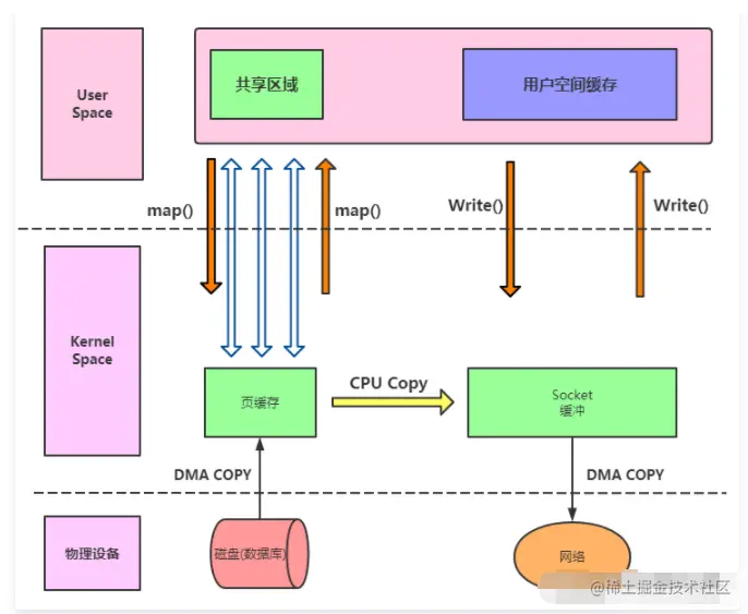 使用 mmap 的目的是将内核中读缓冲区(read buffer)的地址与用户空间的缓冲区(user buffer)进行映射,从而实现内核缓冲区与应用程序内存的共享,省去了将数据从内核读缓冲区(read buffer)拷贝到用户缓冲区(user buffer)的过程,然而内核读缓冲区(read buffer)仍需将数据到内核写缓冲区(socket buffer)。