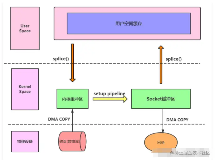 由图可知:DMA拷贝,需要经过四次数据拷贝,四次上下文切换,即使使用了DMA来处理与硬件的通讯,CPU仍然需要处理两次数据拷贝,与此同时,在用户态与内核态也发生了多次上下文切换,无疑也加重了CPU负担。