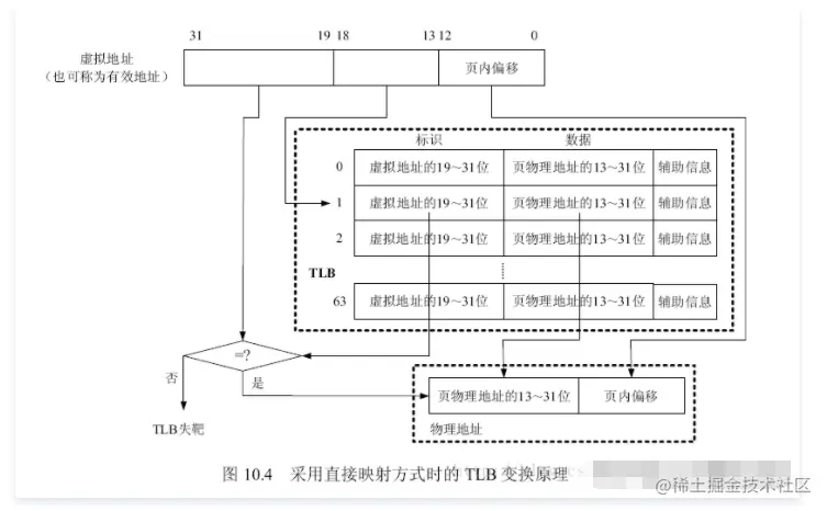 页表一般都很大,并且存放在内存中,所以处理器引入MMU后,读取指令、数据需要访问两次内存:首先通过查询页表得到物理地址,然后访问该物理地址读取指令、数据。为了减少因为MMU导致的处理器性能下降,引入了TLB,TLB是Translation Lookaside Buffer的简称,可翻译为“地址转换后援缓冲器”,也可简称为“快表”。简单地说,TLB就是页表的Cache,其中存储了当前最可能被访问到的页表项,其内容是部分页表项的一个副本。只有在TLB无法完成地址翻译任务时,才会到内存中查询页表,这样就减少了页表查询导致的处理器性能下降。