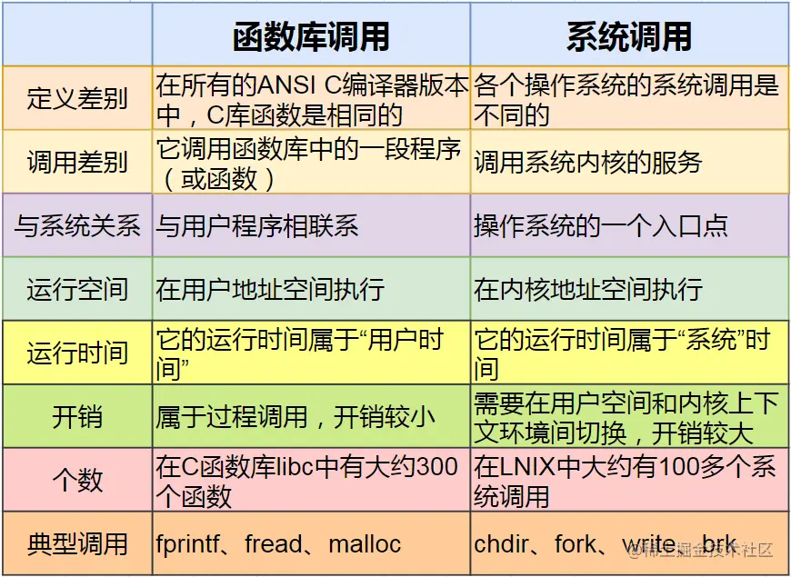- (2) 库函数在用户地址空间执行,系统调用是在内核地址空间执行,库函数运行时间属于用户时间,系统调用属于系统时间,库函数开销较小,系统调用开销较大