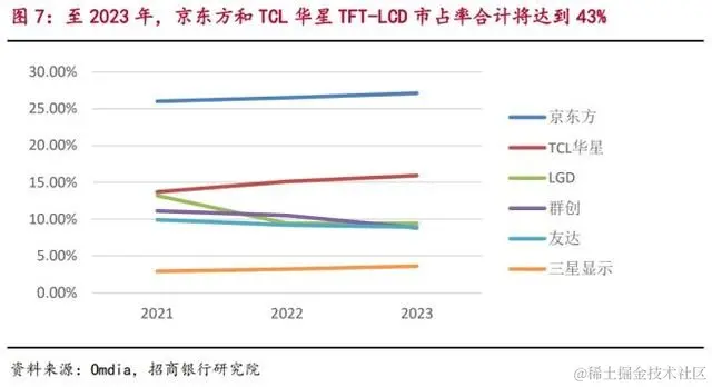 此外,在LCD面板中,即使三星和LG两大龙头宣布退出,还会有后来者相继而上。京东方和TCL华星或许能一跃成为全球LCD领头羊。据Omdia预计,2021年京东方和TCL华星两家龙头厂商在TFT-LCD的市场份额将达39.7%,2023年市占率将达到43%,市场份额也呈现向头部进一步集中趋势。