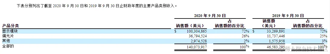 截至 2019 年 9 月 30 日和 2020 年 9 月 30 日,奥斯汀科技的主营业务中,显示模块的收入占总营收比例均为72%,偏光片的收入占总营收比例分别为25%与26%。显然,显示模块占总收入比重最大。