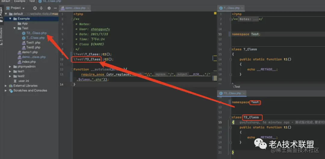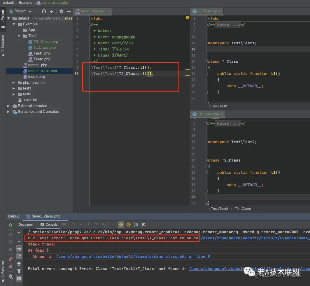 PHP Fatal error: Class 'Test\Test1\T_Class' not found in /home/wwwroot/default/Example/demo_class.php on line 9