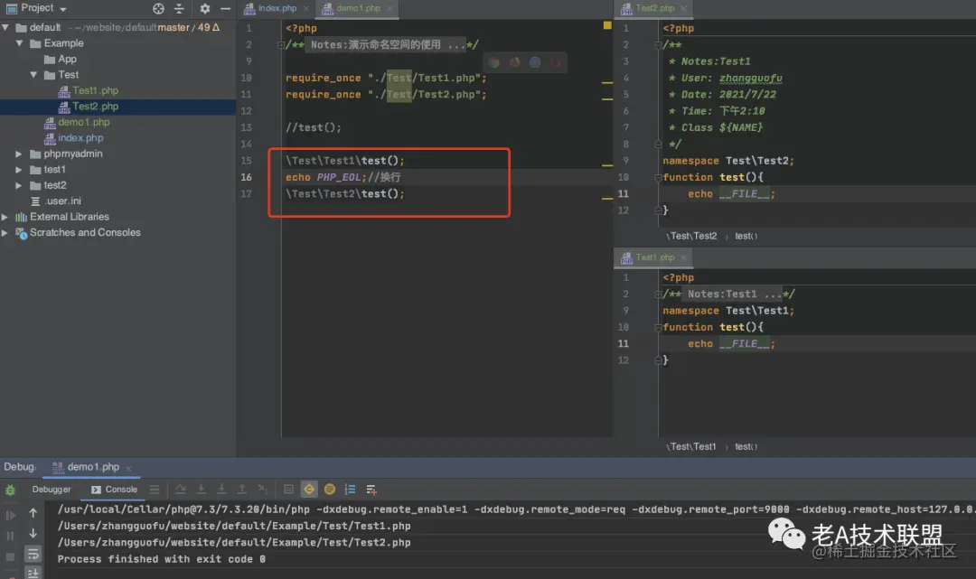那我们把命名空间给加上去,看看怎么样,发现执行成功了,而在每个调用test函数前,都加上了各自的命名空间。这就是命名空间的作用