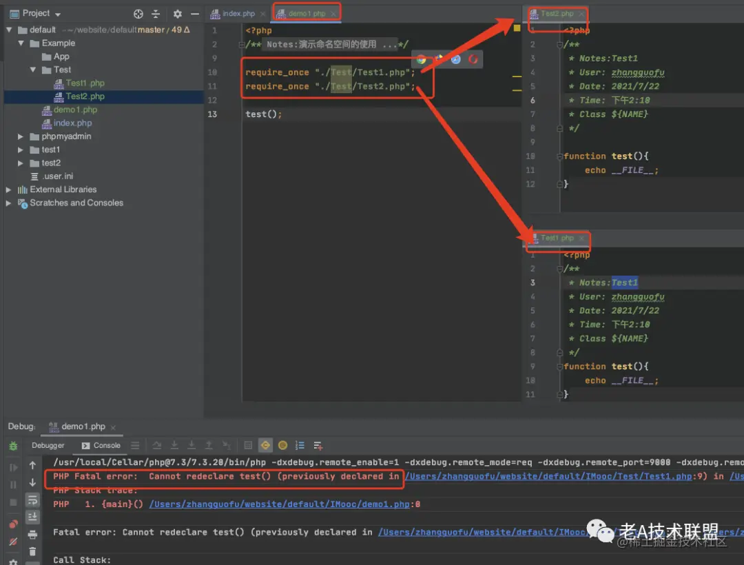报错信息PHP Fatal error: Cannot redeclare test() (previously declared in /Users/zhangguofu/website/default/IMooc/Test/Test1.php:9) in /Users/zhangguofu/website/default/IMooc/Test/Test2.php on line 12