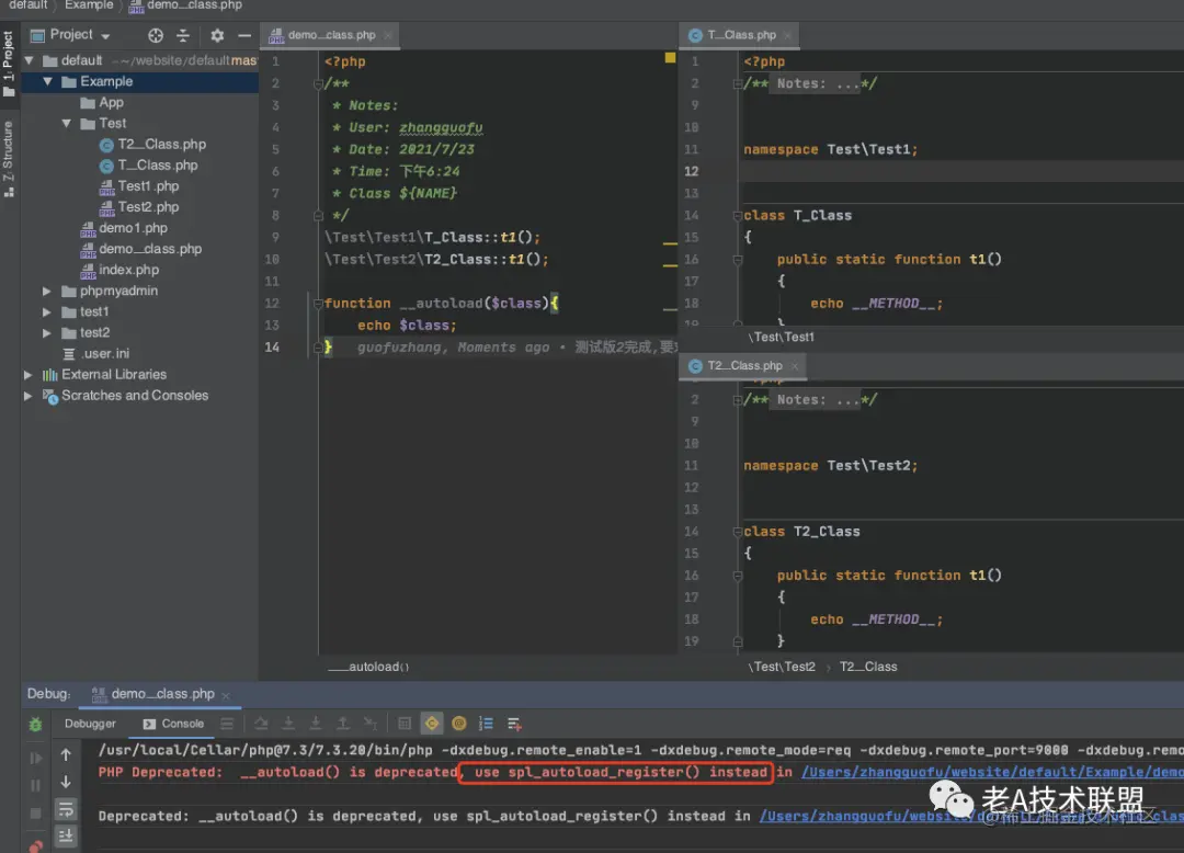 __autoload,实现类的自动载入,当一个类被用到而没有被载入的话,这个函数就会试图载入这个类文件,举个栗子看一下。 - 我们使用autoload(该函数在7.2以后已经被弃用) 函数加载类