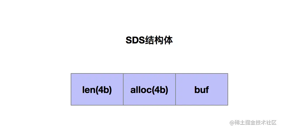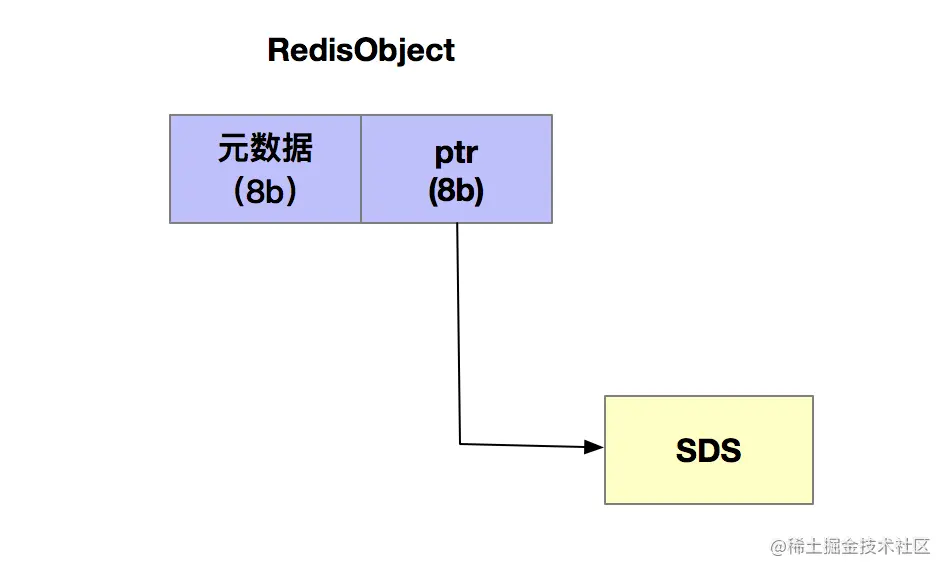 可以看到,在SDS结构体中,除了有保存实际数据的buf,还有len和alloc的额外元数据的开销。另外对于String类型来说,除了SDS的额外开销外,还有一个叫做RedisObject结构体的开销。因为Redis的数据类型有很多,不同的数据类型都有相同的元数据要记录(例如最后一次访问时间),所以Redis会采用一个叫做RedisObject结构体来统一记录这些元数据。一个RedisObject包含了一个8字节的元数据和一个8字节的指针,这个指针指向具体数据所在,例如String类型的SDS结构体所在的内存地址。如下图所示: