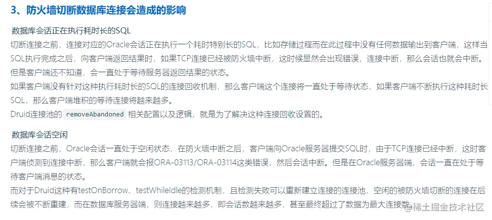打开druid.keepAlive之后,当连接池空闲时,池中的minIdle数量以内的连接,空闲时间超过minEvictableIdleTimeMillis,则会执行keepAlive操作,即执行druid.validationQuery指定的查询SQL,一般为select * from dual,只要minEvictableIdleTimeMillis设置的小于防火墙切断连接时间,就可以保证当连接空闲时自动做保活检测,不会被防火墙切断这就是整个问题的解决,希望可以帮到大家。