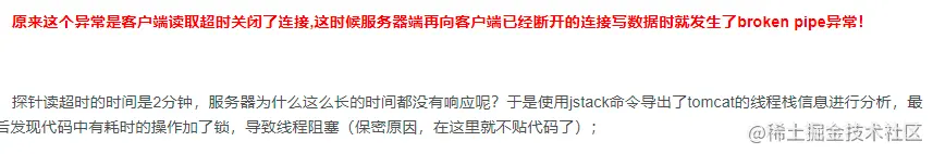 在这里面的文章里找到一些有用的内容,原来是因为接口响应过慢,导致前端那边设置的超时时间到了,直接主动切断了与后端的连接,但是后端还在查数据,查完以后想返给前端,发现管道已经断掉了,就只好报这个错误的