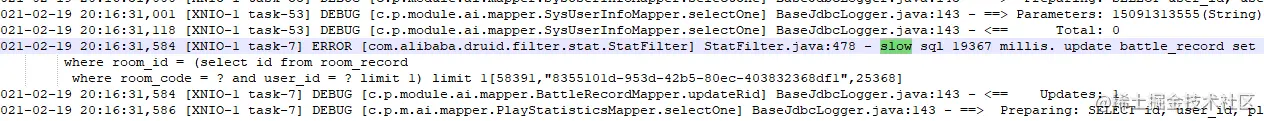 1.在sql日志的打印中,喜不自胜的看到了一连串了slow 慢sql语句,这下子可以从这些sql语句上着手的,这是肯定要优化的,都是一些执行时间大于1s的,更有甚者到达了5-6s。