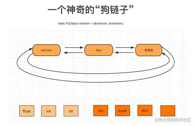 实现:在python的底层再维护一个链表,链表中专门放哪些可能存在循环应用的对象(容器类对象:list、tuple、dict、set)。