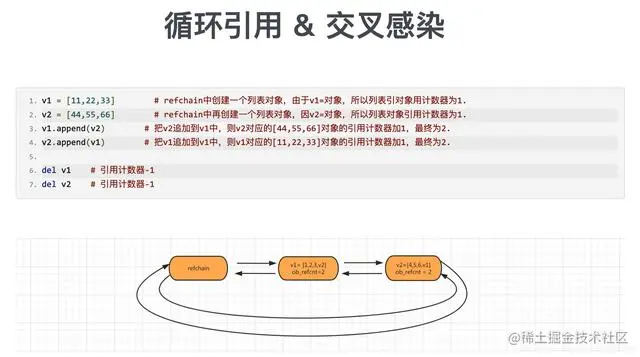 由于 v1 指向的对象引用了 v2,v2 指向的对象也引用了 v1,当将 v1、v2 两个变量删除时,虽然引用计数器会减1,但是两个对象间还存在循环引用,而此时已经没有变量能去指向它们,这两个对象就会在内存中常驻无法处理。