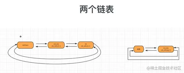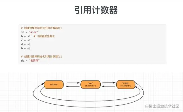 在python中维护了一个refchain的双向环状链表,这个链表中存储程序创建的所有对象,每种类型的对象都有一个ob_refcnt引用计数器的值,当引用计数器变为0时会进行垃圾回收(对象销毁、refchain中移出)。