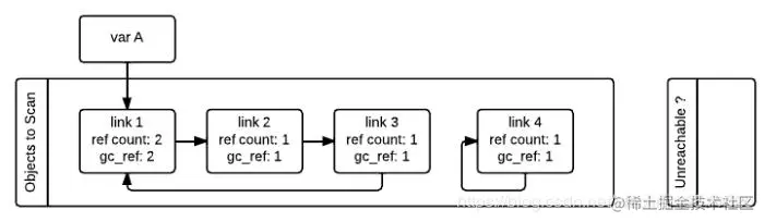 如果gc_ref不为0,那么这个对象会被标记为可达的GC_REACHABLE,同时当gc发现有一个节点是可达的,那么它会递归式的从该节点触发将所有可达的节点标记为GC_REACHABLE,这样把link2、link3救回来