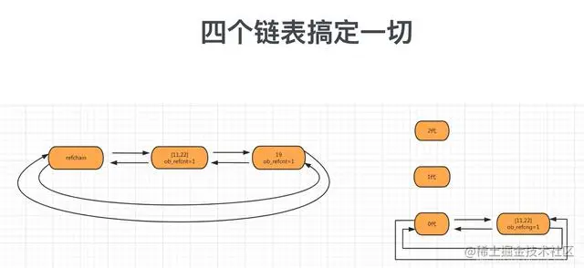 但是,在python中对于那些可以有多个元素组成的对象可能会存在循环引用的问题,为了解决这个问题,python又引入了标记清除和分代回收,在其内部维护了4个链表,分别为: