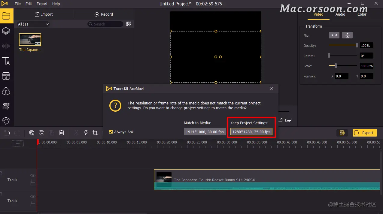 项目设置完成后,您现在可以将视频导入时间线。将出现一个提示,让您选择要使用的分辨率和帧速率。要使您的视频方形,您应该选择“保留项目设置”。然后您可以开始编辑并导出您的视频。