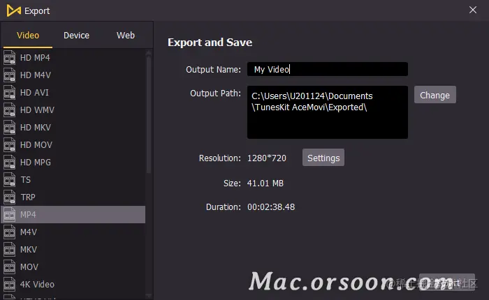 完成视频编辑后,单击左中角的导出按钮并导出视频。单击设置,您将能够选择输出参数。通过单击“更改”按钮,您可以更改输出位置。