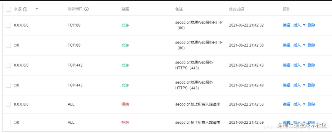 给大家分享一套安全组的配置,大家可以根据站点自身的需求进行调整,常见的服务器腾讯云、阿里云等云服务后台都可以找到安全组的配置位置,大家根据下面的配置进行设置即可。