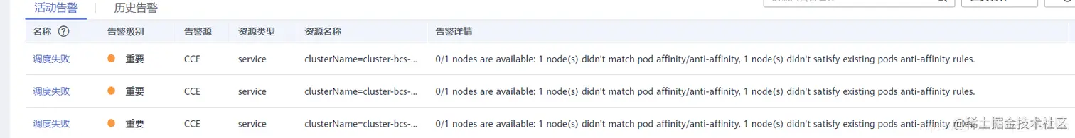 调度失败 重要 CCE service clusterName=cluster-bcs-xzzv;clusterID=7ca30461-b4c8-11eb-bfc3-0255ac1022c9;kind=Pod;namespace=kube-system;name=coredns-8687fc4977-8wvb9;uid=3c174f7d-6492-49f9-a8b1-6a056fc141dc 0/1 nodes are available: 1 node(s) didn't match pod affinity/anti-affinity, 1 node(s) didn't satisfy existing pods anti-affinity rules. 2021/05/15 11:50:51 GMT+08:00
