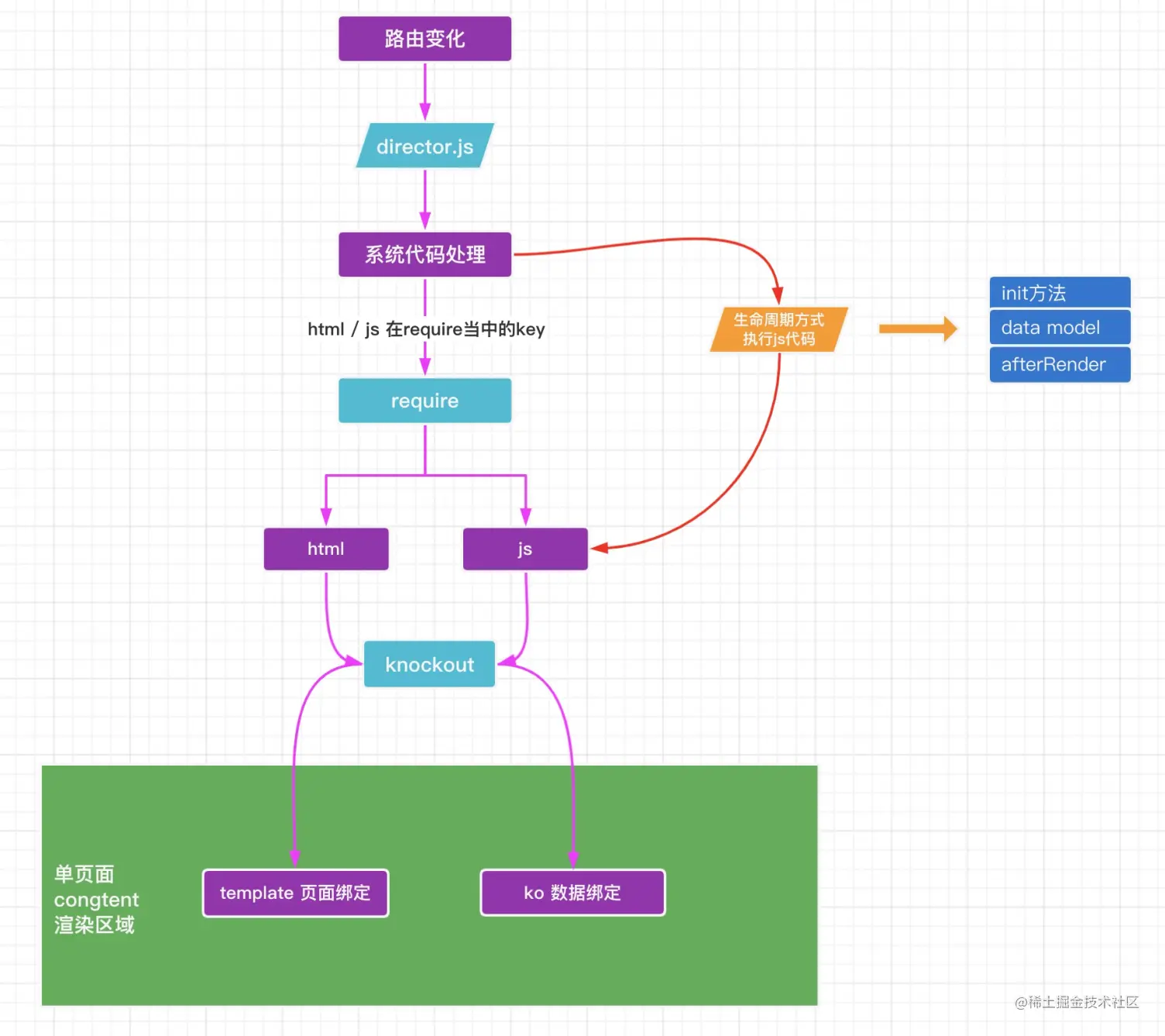 接下来主要的问题是: 监控路由变化,在系统代码里可以动态处理当前路径对应的html / js资源。然后对于js代码的执行进行ko的绑定和生命周期方式的拆分。