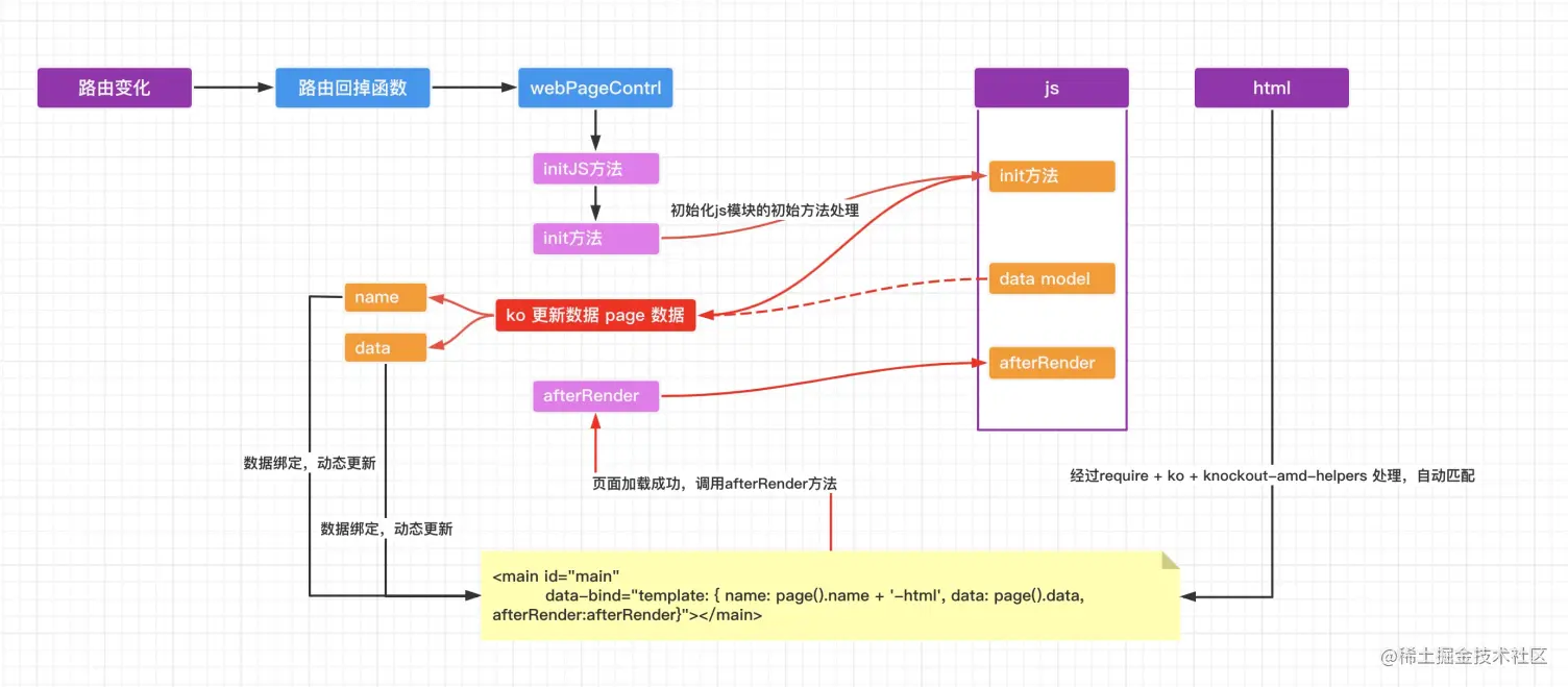 - js控制动态路由的跳转渲染具体的页面,那html的渲染和js的执行如何处理,因为这里我们希望通过ko来实行一个页面和数据model的绑定,所以这里还需要添加上ko绑定页面数据data的处理,所以对于js文件的处理会划分成类似react / vue 生命周期的方式来处理。