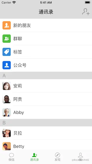 接下来实现通讯录界面,这节课先只实现到下图这样,边上的索引下节课再实现。