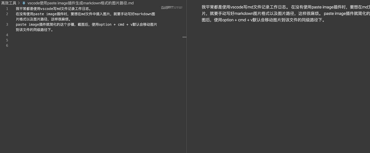 vscode使用paste image插件生成markdown格式的图片路径 公众号程序员灿灿 2021-07-25 2,472 阅读1分钟 我平常都是使用vscode写md文件记录工作日志。 在没有使用paste image插件时,要想在md文件中插入图片,就要手动写好markdown图片格式以及图片路径,这样很麻烦。 paste image插件就简化的这个步骤,截图后,使用option + cmd + v默认会移动图片到该文件的同级路径下。