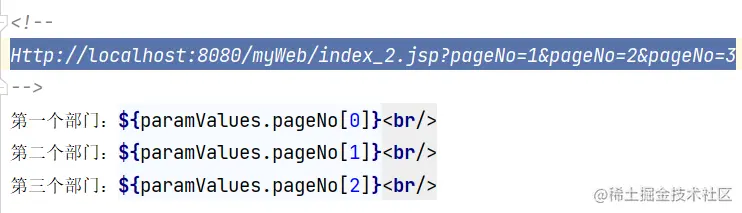<% String array[] = request.getParamterValues("pageNo"); %> <!--以前的写法--> 第一个值:<%=array[0]%> 第二个值:<%=array[1]%>输出的结果: