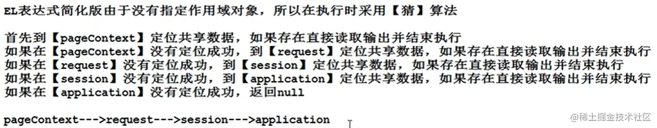 工作原理:EL表达式简化版由于没有指定作用域对象,所以在执行时采用【猜】算法。