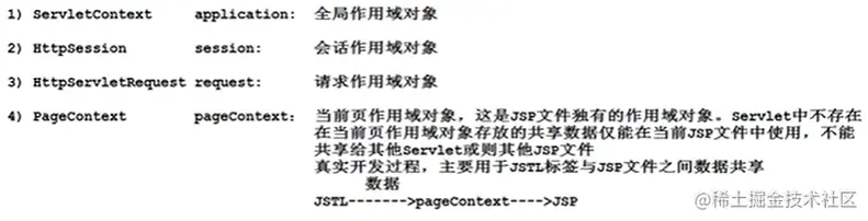 注意:JSP有四个作用域对象,Servlet有三个作用域对象