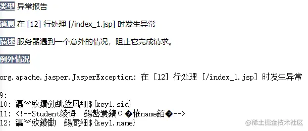 以下程序报错的原因:Student中的全局变量为 sname,而在index_1.jsp写成了name导致在index_1.jsp中找不到 name 这个属性,此时会发生对象中没有找到指定属性错误