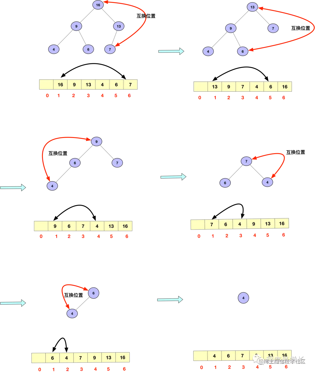 我们首先将数组原地建一个堆。“原地”的含义就是不借助另一个数组,就在原数组上操作。我们的实现思路是从后往前处理数据,并且每个数据都是从上向下调整。