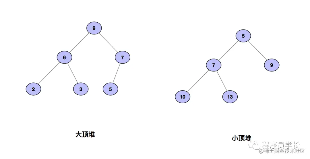 对于每个节点的值都大于等于其子树中每个节点的值的堆,我们叫做“大顶堆”。对于每个节点的值都小于等于其子树中每个节点的值的堆,我们叫做“小顶堆”。