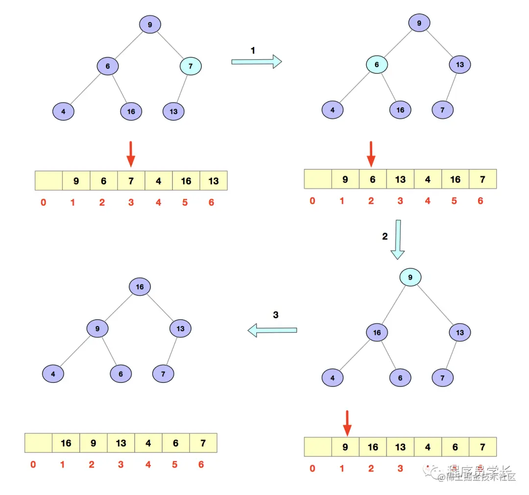 这个过程很简单,我们让新插入的节点和其父节点对比大小。如果不 满足子节点小于等于父节点,我们就互换两个节点。一直重复这个过程,直到满足要求。