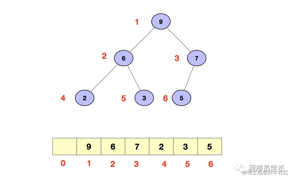 对于一个完全二叉树来说,用数组来存储是非常节省存储空间的。因为我们不需要存储指向左右子节点的指针,单纯的通过数组下标就可以找到一个节点的左右子节点和父节点。如下图所示。