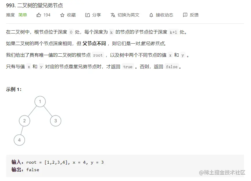 题目地址:993. 二叉树的堂兄弟节点 - 力扣(LeetCode) (leetcode-cn.com)