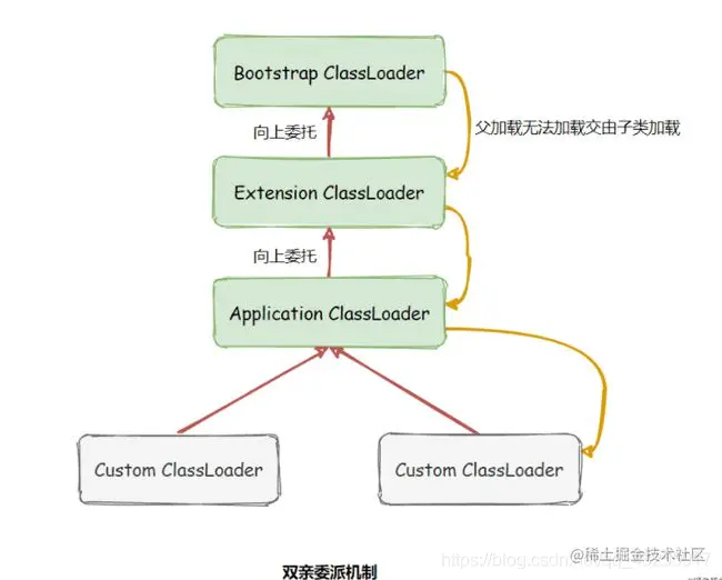当一个类加载器收到加载类的请求时,不会自己去尝试先加载该类,而是把该加载请求委托给父类,若是没有父类就是直接找顶层类加载器,若是有父类,并且父类还有父类加载器,依次向上委托,直到上面的所有父类都无法完成加载是,才会自己去加载,若是加载失败就会抛出异常。