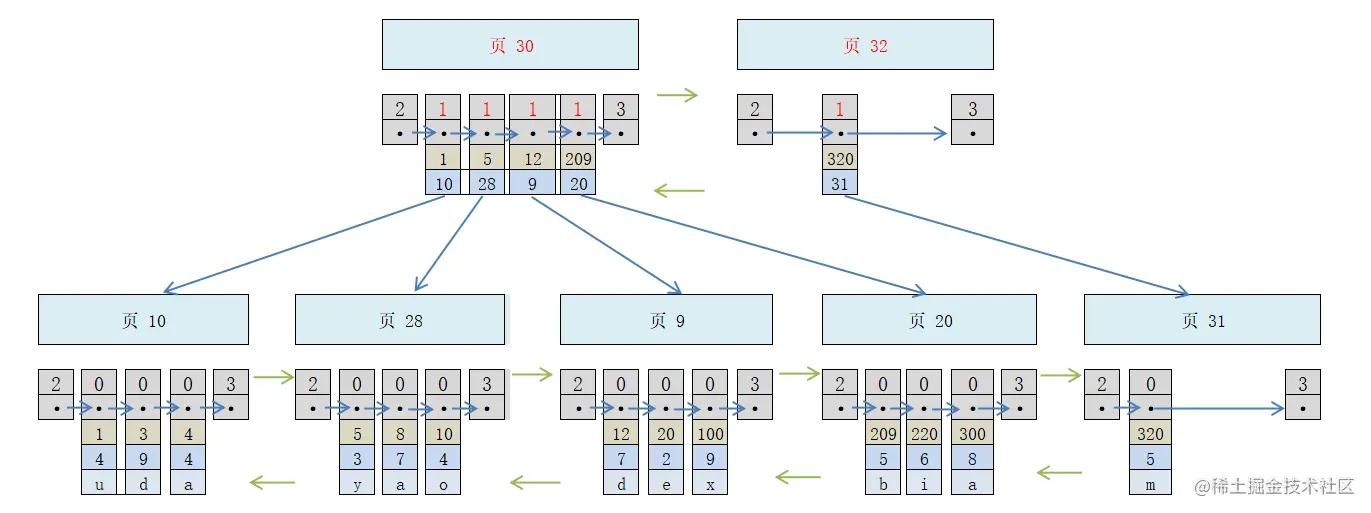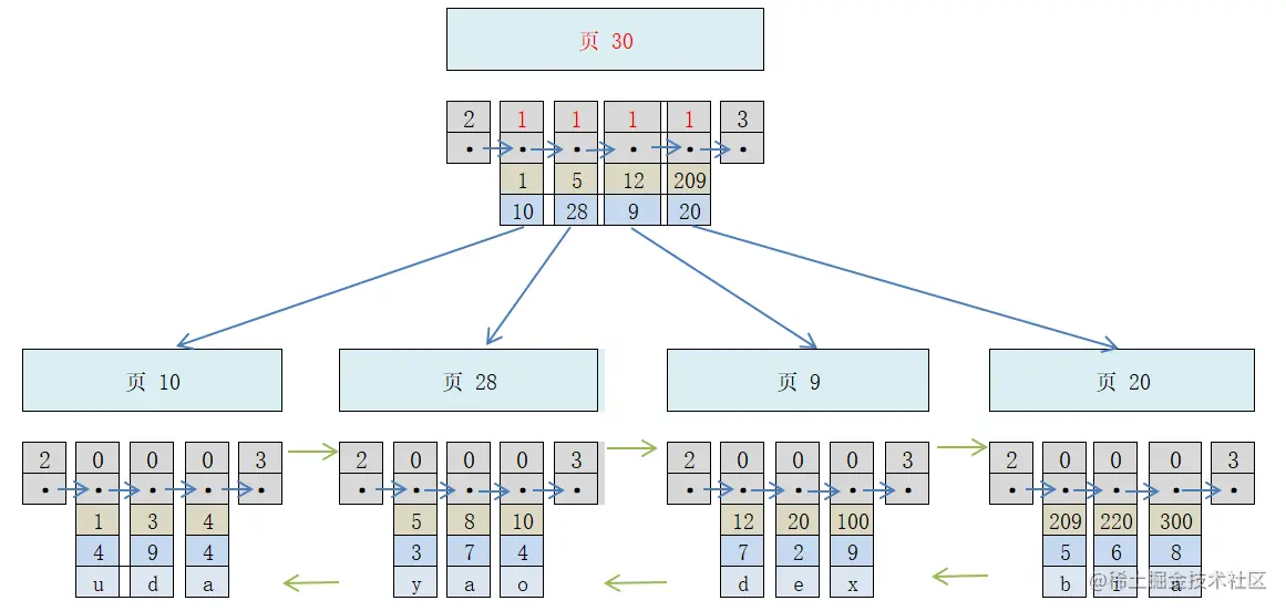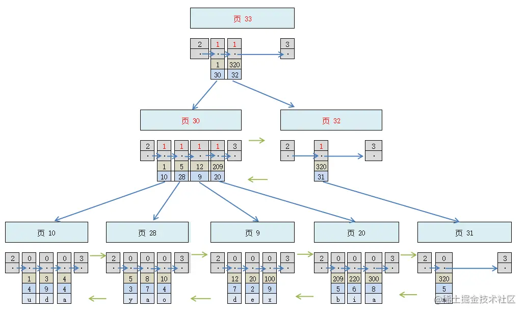 - 先目录项页(页30)通过二分法快速找到对应的目录项记录。因为 12<20<209,所以目标记录在页 9。