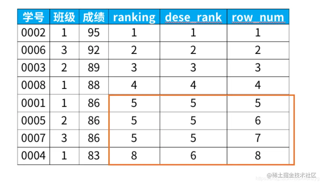 3)row_number函数:这个例子中是5位,6位,7位,8位,也就是不考虑并列名次的情况。比如前3名是并列的名次,排名是正常的1,2,3,4。