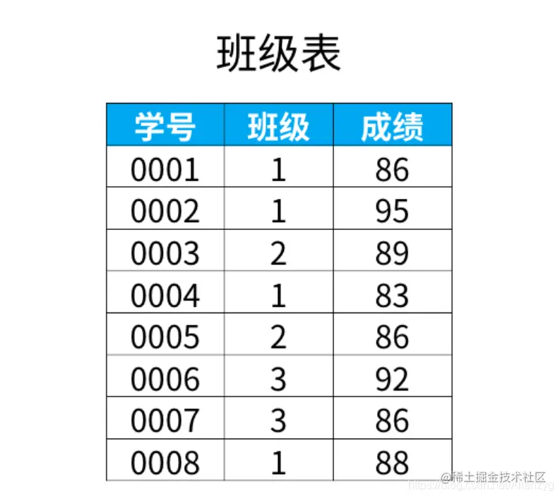 下图是"班级"表中的内容,记录了每个学生所在班级,和对应的成绩。