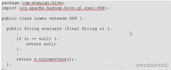 Create function mylower(string) returns string location ‘/hive.jar’ symbol=’类名全路径(包名+类名)’;