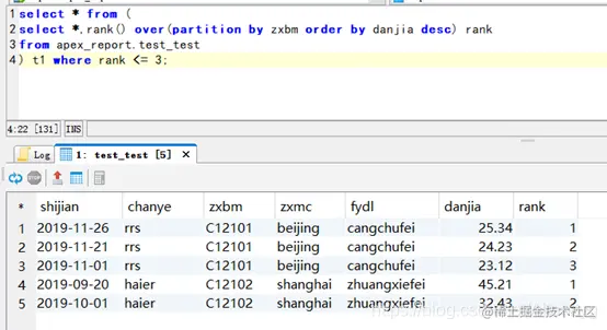 select * from (select *,rank() over(partition by zxbm order by danjia desc) rank from apex_report.test_test) t1 where rank <= 3;