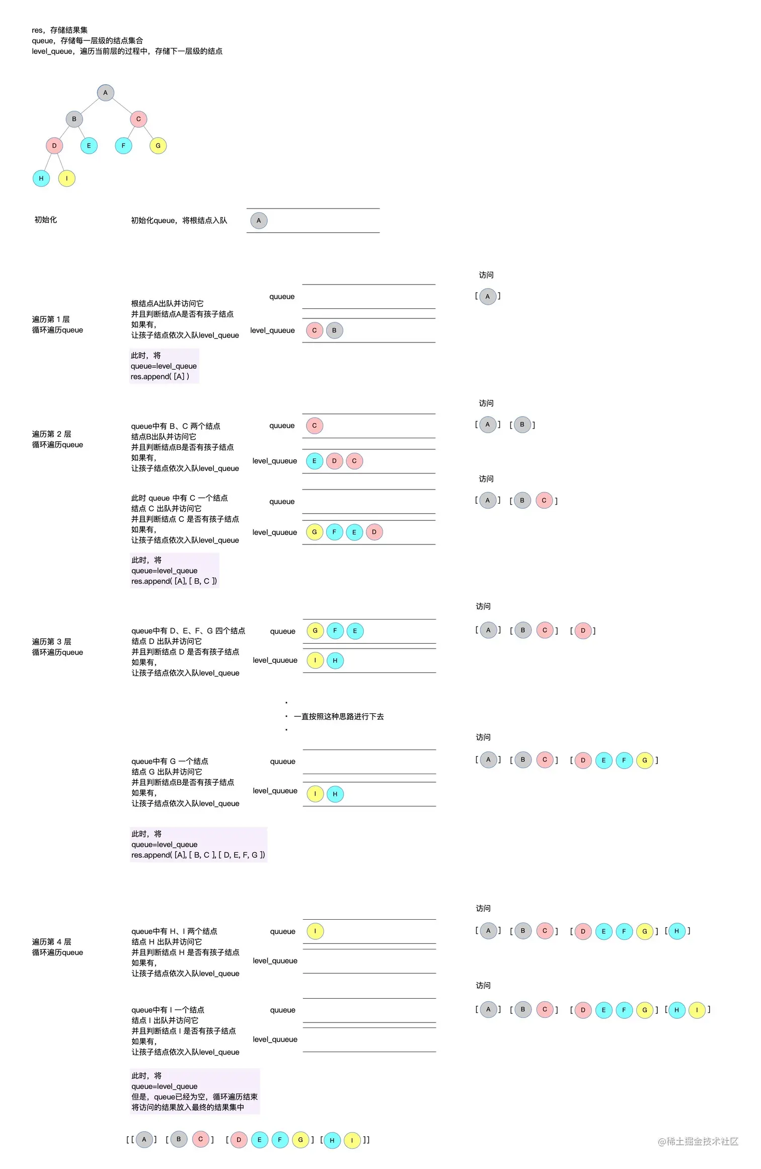 每次循环遍历当前层queue中结点的同时,将该层结点集写进一个临时list,将下一层的结点入队到 level_queue 中。之后将 level_queue 赋值给 queue,循环执行,直到 queue 为空。