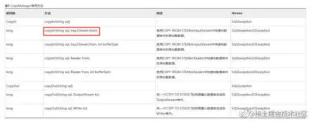 积攒的数据最终是要通过 copymanager 接口导入数据库中的,因此其对象类型需要是 copymanager 接口可以调用的。从下图中可以看出,其对象类型为 InputSream。