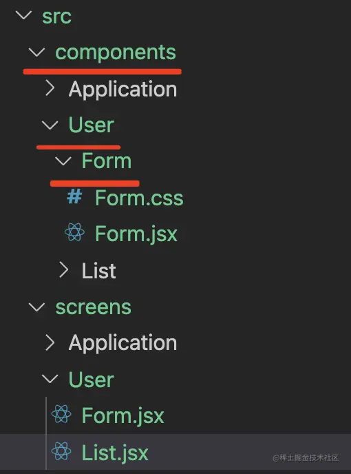 当一个组件有不止一个文件的时候,我们会将这个组件和它对应的文件放在同一个文件夹下,并且使用同一个名字来命名,比如现在有一个组件Form.jsx,引用了Form.css中的样式,那目录结构就会像这样: