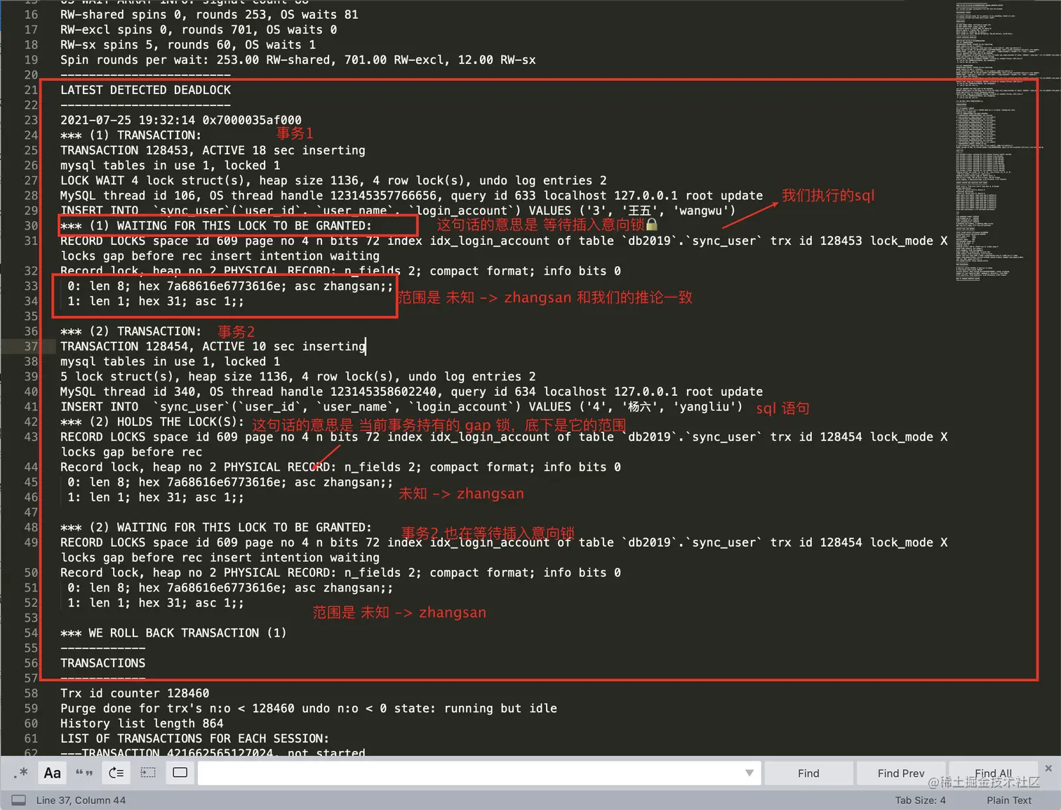 锁已经分析完毕了,接下来,我们需要去查看一下事务的日志结果