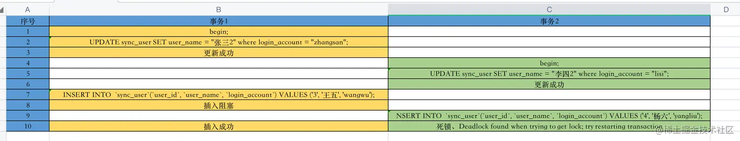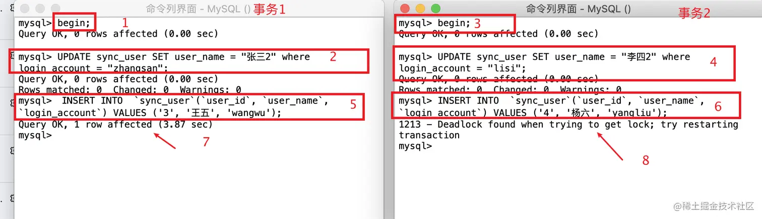 回到事务2,执行插入语句 > INSERT INTO sync_user (user_id, user_name, login_account) VALUES ('4', '杨六', 'yangliu'); -- 出现死锁,并且事务1 的插入语句执行成功