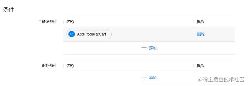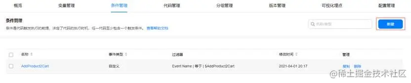 在条件管理中点击“新建”,条件类型选择“自定义”,此条件的触发条件选择“部分事件”,变量选择“Event Name”,操作符选择“等于”,值设置为“$AddProduct2Cart”。