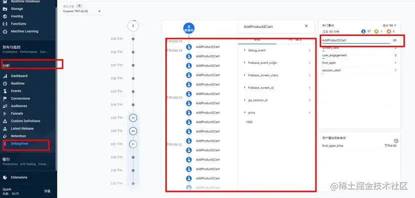 如上图所示,在导航栏中的“分析”->“DebugView”里面,查看最近上报的数据。