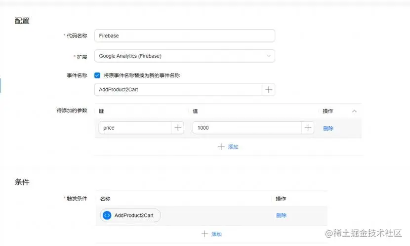 事件名称:非强制勾选。此处勾选,并修改事件名称为AddProduct2Cart(原因:上报Firebase的事件名称中不能包含$符号)